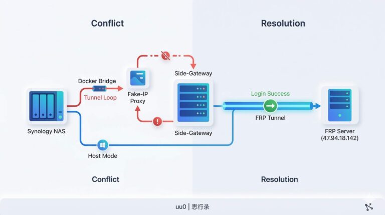 本文分析了群晖NAS在切换至旁路由架构(iStoreOS + OpenClash)后,FRP内网穿透服务失效的故障。核心原因在于:OpenClash启用的Fake-IP功能会返回虚假IP(198.18.x.x),导致FRP客户端连接目标地址错误;同时,旁路由环境改变了流量路径,使群晖访问自身服务的流量被导向旁路由。若OpenClash分流规则不当,这部分流量可能陷入死循环或被防火墙拦截,最终引发连接超时。解决方案需调整网络规则或绕过相关流量处理。